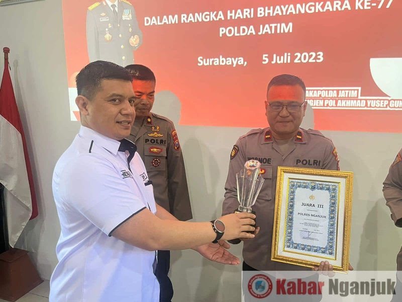 Nganjuk, KabarNganjuk.Com – Polres Nganjuk diwakili KA SPKT Polres Nganjuk IPDA Wisnu dan anggotanya meraih juara 3 dalam lomba Pelayanan 110 pada tingkat Polda Jawa Timur dalam rangka memperingati Hari Bhayangkara ke – 77 tahun 2023.