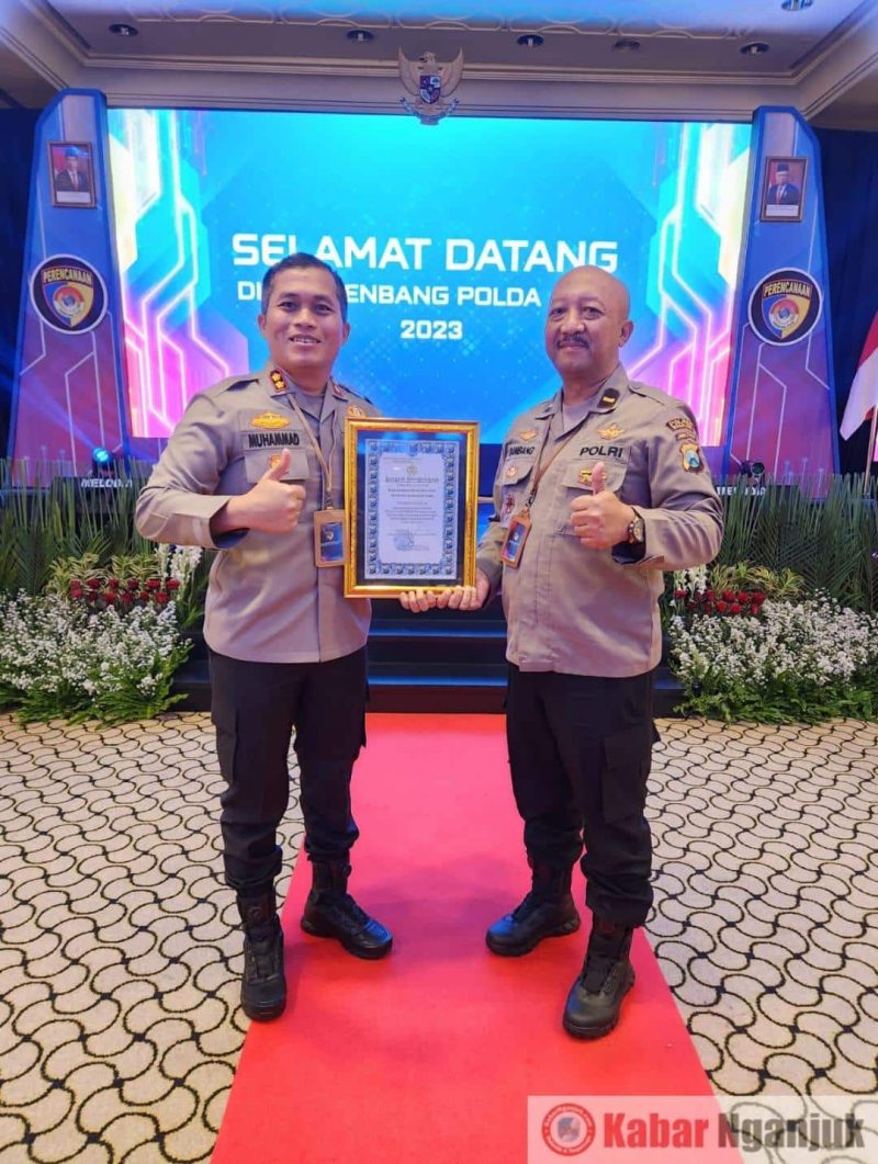 Penghargaan tersebut diserahkan oleh Kapolda Jatim IRJEN POL Dr. Toni Harmanto, M.H., dan diterima langsung oleh Kapolres Nganjuk AKBP Muhammad, S.H., S.I.K., M.Si., di hotel Bhumi Surabaya bersamaan dengan Musrenbang Polda Jatim 2023.
