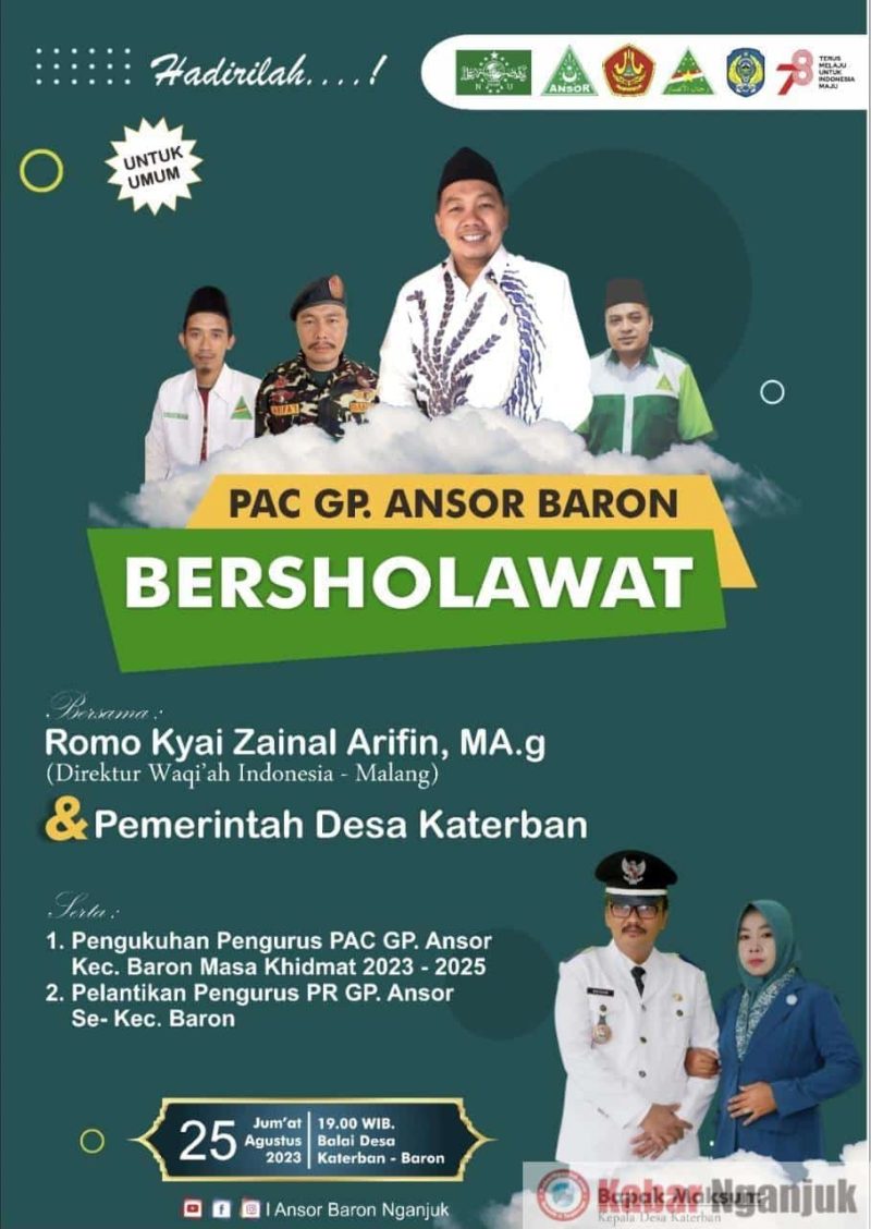 KabarNganjuk.com-Pada Hari Jum’at 25 Agustus 2023, Pimpinan Anak Cabang (PAC) Gerakan Pemuda (GP) ANSOR Baron menggelar acara sholawatan bersama, yang digelar di Balai Desa Katerban Baron, mulai jam 10.00 WIB dan dibuka untuk umum.
