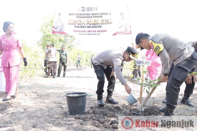 Sementara itu Kabag SDM Polres Nganjuk, Kompol Burhanudin, S.Sos., menjelaskan Polres Nganjuk berkesempatan menanam berbagai jenis pohon kayu keras dan buah-buahan sebanyak 1000 batang seperti Mahoni, Sengon Laut, Trembesi, Buah Kelengkeng, dan Buah Jeruk.