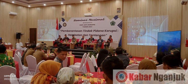 KabarNganjuk.com- Sebanyak 150 peserta dari kalangan Mahasiswa, unsur ASN, Peradi, awak Media, Lembaga Swadaya Masyarakat ( LSM), Masyarakat maupun Tokoh Agama, juga dari jajaran TNI – POLRI telah mengikuti Seminar Nasional dalam rangka memperingati Hari Anti Korupsi Tahun 2023, yang bertempat di Ballroom Front One Ratu Hotel Begadung Nganjuk ( 04/12/2023).
