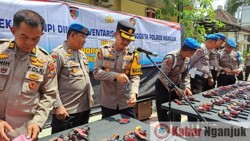 Pemeriksaan senjata api khusus laras pendek Revolver dan pistol beserta amunisi yang dipinjam pakai oleh personel Polres Nganjuk dan Polsek jajaran Polres Nganjuk, dilakukan secara teliti dari kebersihan dan kelengkapan surat ijin pemegang senpi.