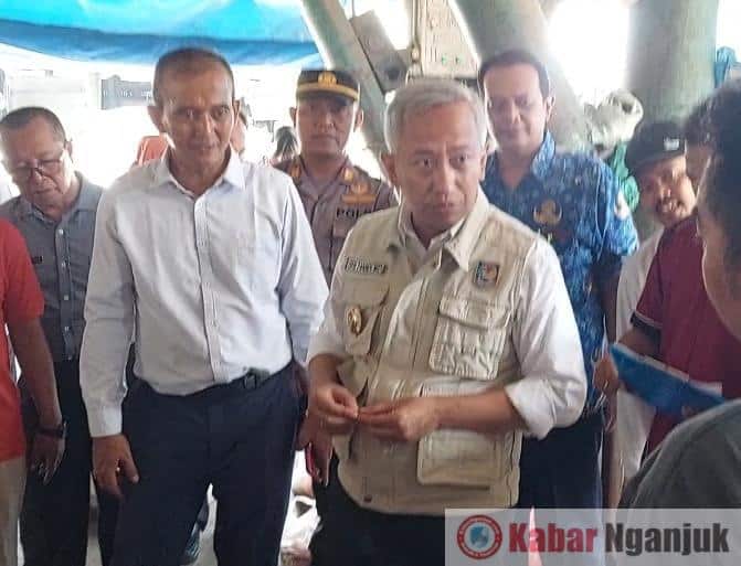 Nganjuk, KabarNganjuk.com – PJ Bupati Sri Handoko Taruna bersama dengan Kepala Dinas Perindustrian dan Perdagangan (Disperindag) Haris Jatmiko menggelar inspeksi mendadak (sidak) stok persediaan harga bahan pokok di Gudang bulog Candirejo, Kabupaten Nganjuk dan Pasar Sukoromo, Kabupaten Nganjuk, Jumat (22/12/2023).