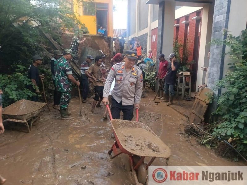TRENGGALEK – Sejumlah personel TNI-Polri bersama petugas dari Kecamatan dan warga bergotong royong membersihkan material tanah longsor yang menimpa bangunan SDN 2 Surenlor, Kecamatan Bendungan, Kabupaten Trenggalek. Selasa, (27/2).