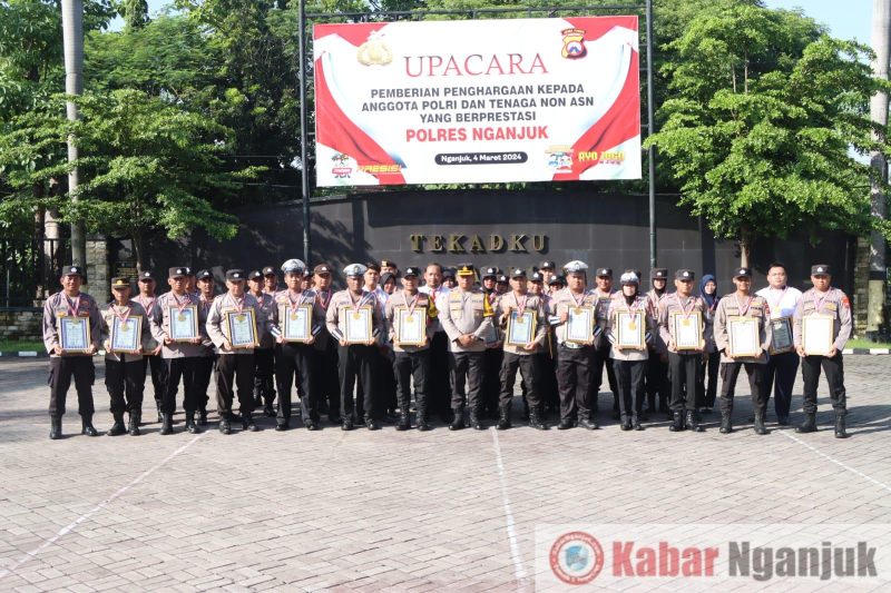 KabarNganjuk.com – Kapolres Nganjuk, AKBP Muhammad, S.H., S.I.K., M.Si., diwakili Wakapolres Nganjuk Kompol Subiyantana, S.H., M.H., memberikan piagam penghargaan kepada 41 anggota Polri dan 2 anggota Non ASN, Penghargaan diberikan dalam upacara di lapangan apel Polres Nganjuk, Senin (04/03/2024).