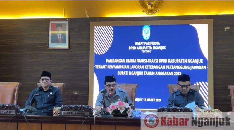 Rapat Paripurna Tentang Pandangan Umum Fraksi-Fraksi DPRD Kabupaten Nganjuk Terkait Laporan Keterangan Pertanggungjawaban Bupati Nganjuk Tahun Anggaran 2023. Fraksi-fraksi yang menyampaikan pandangan umumnya meliputi PKB, Hanura, Golkar, Gerindra, PDI Perjuangan, DKI, dan Nasdem-PPP.
