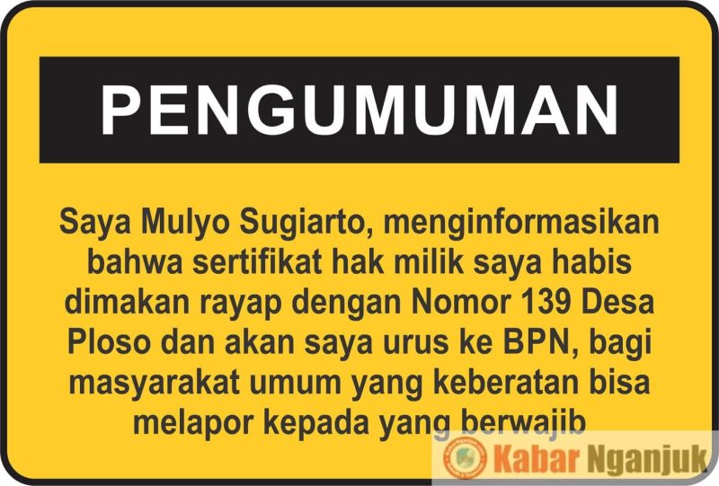 Nganjuk, KabarNganjuk.com – Diinformasikan, Telah rusak Sertifikat Tanah atau Sertifikat Hak Milik (SHM) Nomor 139 Desa Ploso Kecamatan Nganjuk Kabupaten Nganjuk atas nama MULYO SUGIARTO