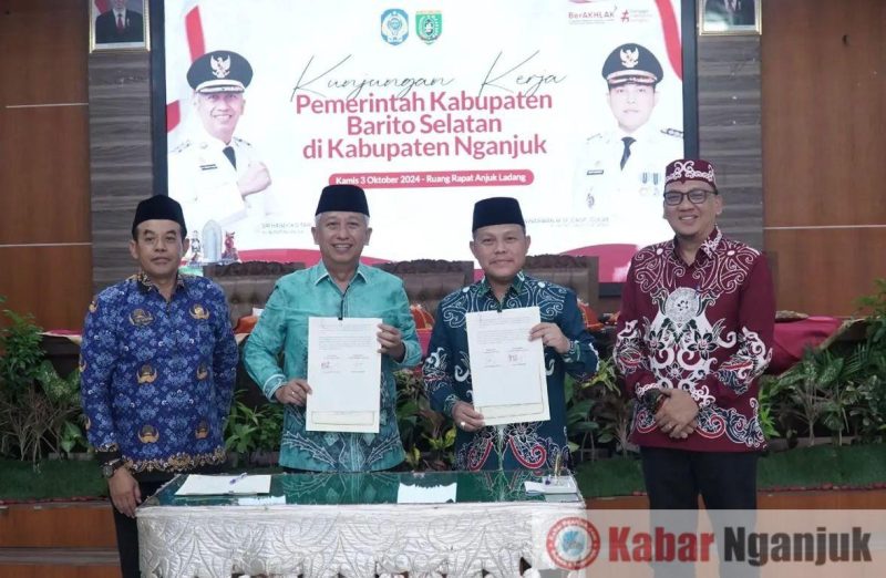 Acara ini kemudian dilanjutkan dengan penandatanganan nota kerjasama antara kedua kabupaten, yang dilengkapi dengan pertukaran cinderamata khas daerah masing-masing. Pj. Bupati Barito Selatan memberikan cinderamata berupa lambang daerah Barito Selatan, batik bermotif anggrek hitam, makanan khas daerah, dan tanaman Anggrek Hitam. Sebagai balasan, Pj. Bupati Nganjuk memberikan cinderamata berupa miniatur Jaya Stamba, batik Anjuk Ladang, makanan olahan dari bawang merah, serta Wayang Kayu khas Anjuk Ladang.