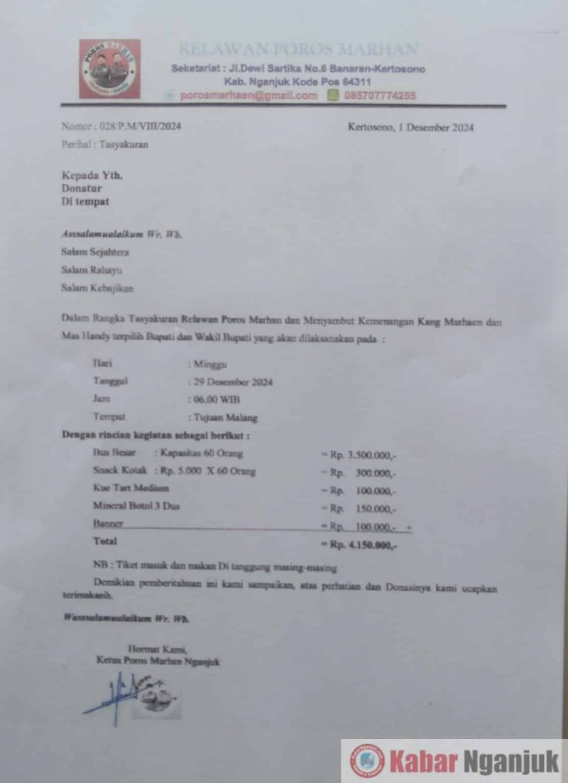 Nganjuk-KabarNganjuk.com, Pasangan calon Marhaen-Handy yang kini tengah menunggu keputusan resmi terkait hasil Pilkada 2024 mendapat perhatian luas setelah beredarnya surat dengan kop Poros Marahan yang meminta bantuan donatur kepada instansi pemerintahan dan desa. Surat tersebut, yang mencantumkan permohonan dukungan materiil untuk kampanye, mengundang kontroversi di kalangan masyarakat dan menimbulkan kekhawatiran terkait potensi pelanggaran aturan.