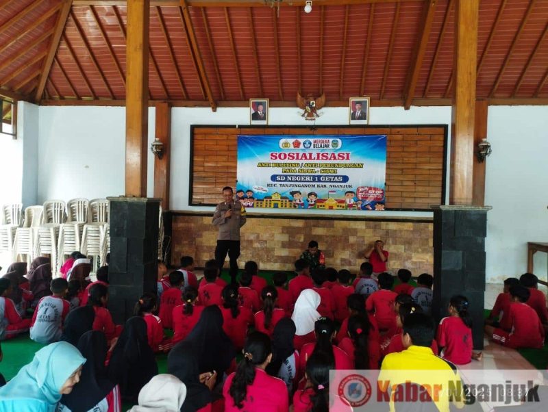 KabarNganjuk.com – Bhabinkamtibmas Desa Getas, Bripka Candra P, bersama Babinsa setempat, melaksanakan penyuluhan mengenai bullying, kenakalan remaja, serta pentingnya cinta tanah air dan kesadaran hukum sejak dini di SDN 1 Getas, Jumat (10/01/2025).