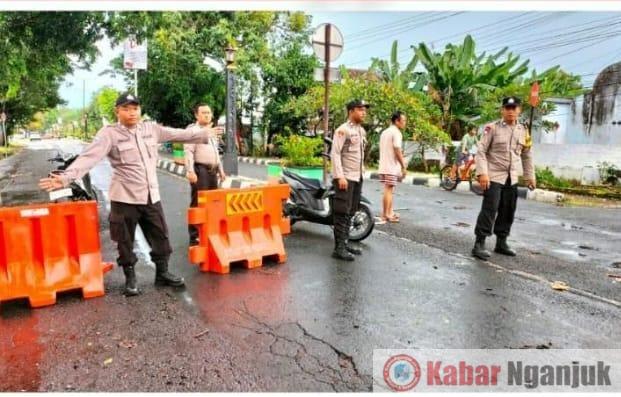Empat personel dari Polsek Loceret turut mengatur arus lalu lintas agar kendaraan tetap bisa melintas dengan aman.