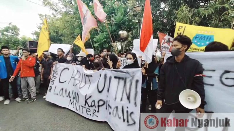 KabarNganjuk.com – Puluhan mahasiswa yang tergabung dalam Aliansi Mahasiswa Nganjuk menggelar aksi unjuk rasa di depan Kantor DPRD Nganjuk, Senin (26/3/25). Mereka menuntut DPRD agar segera menyampaikan aspirasi mereka ke DPR RI terkait sejumlah tuntutan, terutama pengesahan UU Perampasan Aset dan pembatalan UU TNI yang baru saja disahkan.