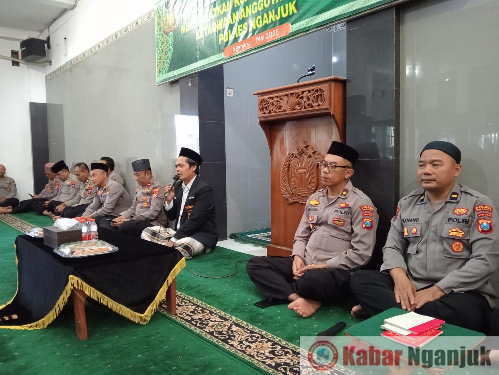 Nganjuk, KabarNganjuk.com– Polres Nganjuk menggelar kegiatan pembinaan rohani dan mental (Binrohtal) rutin di Masjid Al Ikhlas Polres Nganjuk, Kamis (22/5/2025). Kegiatan ini dihadiri oleh Wakapolres Nganjuk KOMPOL Andria Diana Putra, S.E., M.H., para pejabat utama (PJU), anggota Polres dan Polsek jajaran, serta ASN Polri.