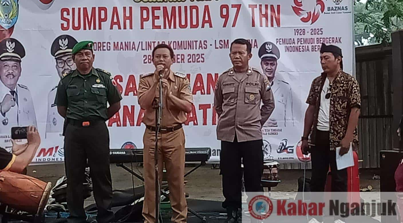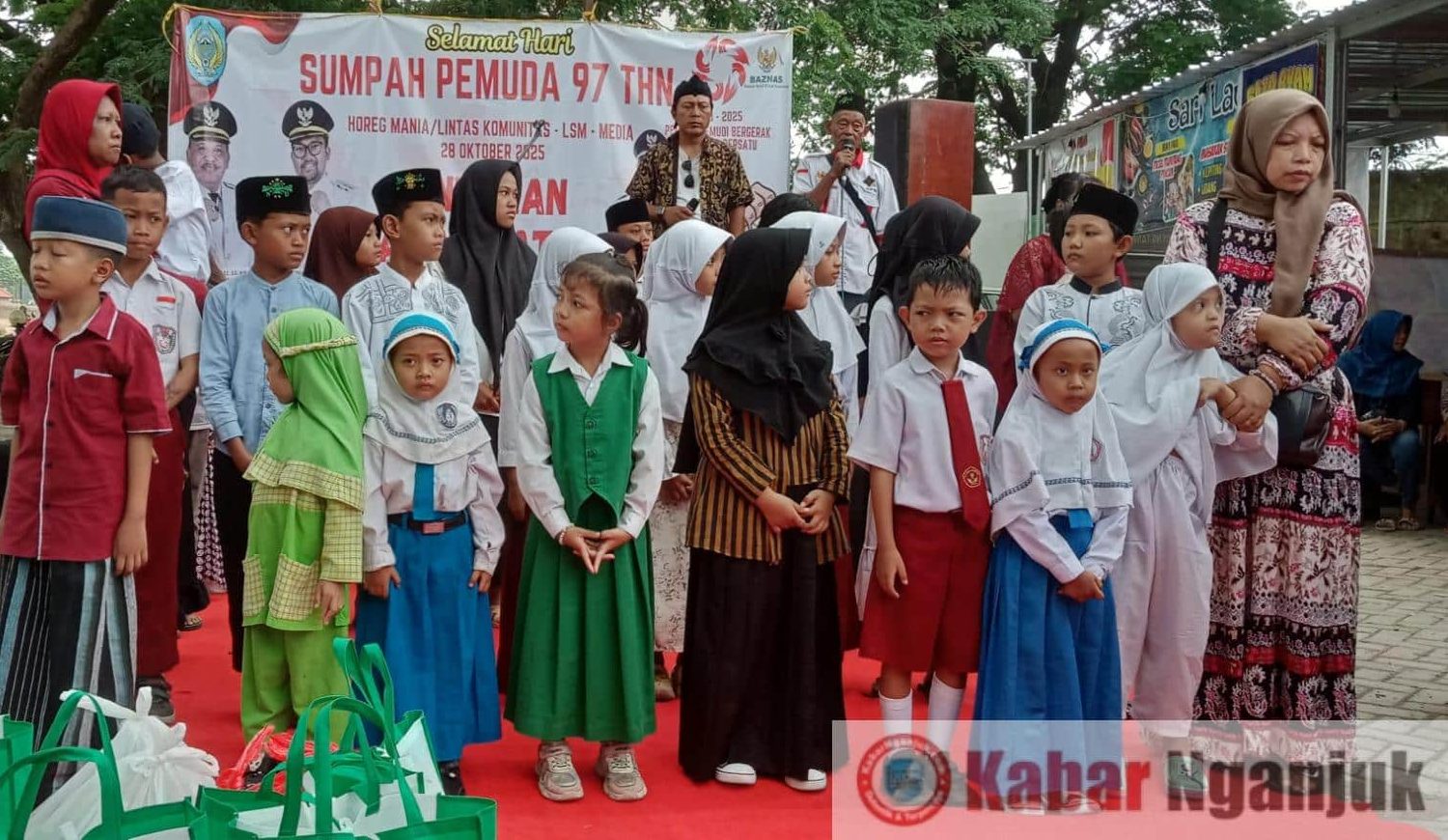 Nganjuk, KabarNganjuk.com- Dalam rangka memperingati Hari Sumpah Pemuda ke-97 tahun 2025 dengan tema ” Pemuda Pemudi Bergerak, Indonesia Maju”, Horeg Mania bersama lintas komunitas, Lembaga Swadaya Masyarakat (LSM), serta awak media menggelar acara santunan anak yatim di halaman Stadion Desa Tembarak, Kecamatan Kertosono, pada Selasa (28/10/2025).
