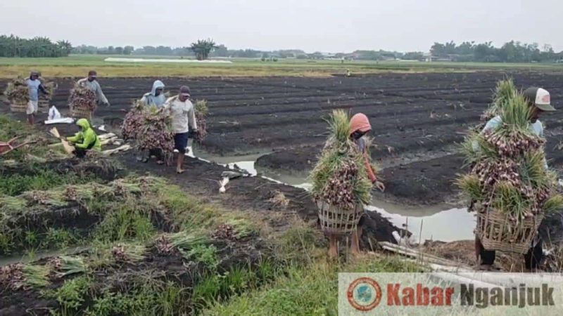 Nganjuk, KabarNganjuk.com – Petani bawang merah di Desa Sumberjo, Kecamatan Sukomoro, Kabupaten Nganjuk mengeluhkan kualitas dan kuantitas hasil panen bawang merah yang menurun drastis pada musim panen kali ini. Penyebab utama masalah ini adalah curah hujan tinggi yang menyebabkan sungai di sekitar wilayah tidak mampu menampung luapan air, sehingga mengakibatkan banjir dan menggenangi area persawahan warga.