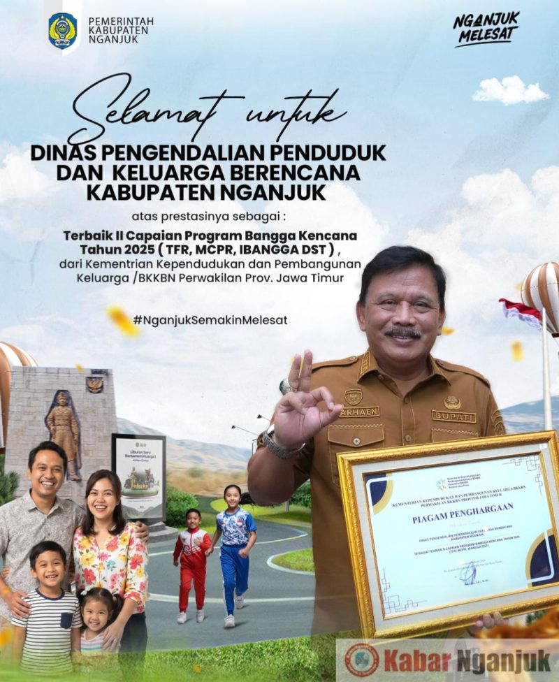 Tak hanya itu, prestasi lain juga turut memperkuat posisi Nganjuk. Dinas Pengendalian Penduduk dan Keluarga Berencana (DPPKB) Kabupaten Nganjuk berhasil meraih penghargaan Terbaik II dalam Capaian Program Bangga Kencana Tahun 2025. Penilaian tersebut mencakup sejumlah indikator penting, seperti Total Fertility Rate (TFR), Modern Contraceptive Prevalence Rate (MCPR), hingga Indeks Pembangunan Keluarga (IBANGGA).
