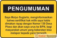Nganjuk, KabarNganjuk.com – Diinformasikan, Telah rusak Sertifikat Tanah atau Sertifikat Hak Milik (SHM) Nomor 139 Desa Ploso Kecamatan Nganjuk Kabupaten Nganjuk atas nama MULYO…